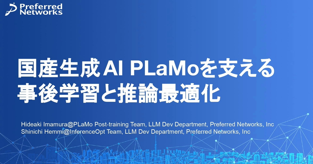 Preferred Networksは、PLaMo 3.0 Primeの開発手法の一部や、国産LLM開発の背景にある同社の戦略的意図を資料で説明しています。