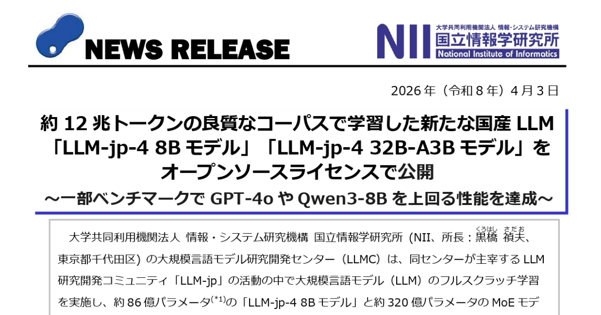 国立情報学研究所は、LLM「LLM-jp-4 8Bモデル」「LLM-jp-4 32B-A3Bモデル」をオープンソースライセンスで公開した。米OpenAIのオープンモデル「gpt-oss-20b」を上回る日本語性能をうたう。